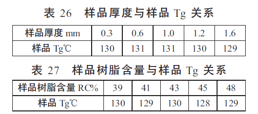 我們還考察了基板厚度, 基板樹脂含量,樣品存放時間對基板Tg 的影響情況。表26,表27 說明,不同基板厚度,不同樹脂含量,對基板的Tg 沒有什么影響(見)。但樣品存放時間對基板的Tg 有一定影響。隨著基板儲存時間延長,基板的Tg 將逐步降低。這與基板在存放過程吸濕有關。因此,覆銅板一定要做防潮包裝,特別對于高Tg 產品。